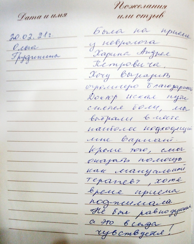 Была на приеме у невролога Харина Андрея Петровича. Хочу выразить огромную благодарность. Доктор искал пути снятия боли, мы выбрали вместе наиболее подходящий мне вариант. Кроме того, смог оказать помощь как мануальный терапевт, хотя время приема поджимало. Не был равнодушным, а это всегда чувствуется!