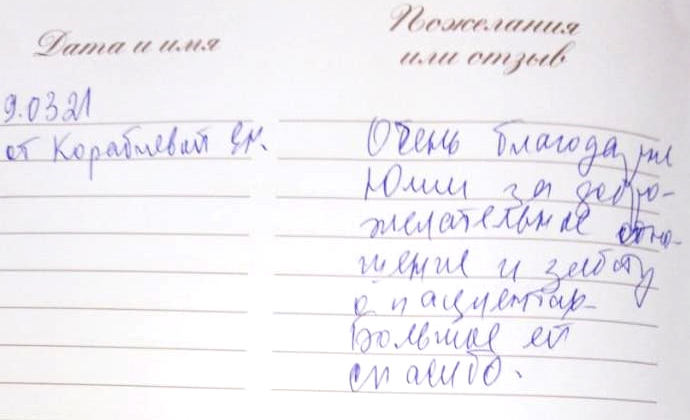 Очень благодарна Юлии за доброжелательное отношение и заботу о пациентах. Большое ей спасибо.