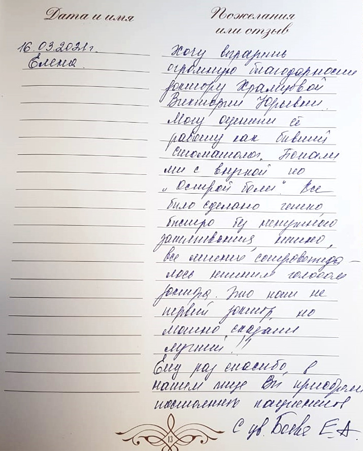 Хочу выразить огромную благодарность доктору Храмцовой Виктории Юрьевне. Могу оценить ее работу как бывший стоматолог. Попали мы с внучкой по "острой боли". Все было сделано четко, быстро, без ненужного затягивания, нежно, все лечение сопровождалось нежным голосом доктора. Это наш не первый доктор, но можно сказать лучший! Еще раз спасибо в нашем лице. Вы приобрели постоянных пациентов.