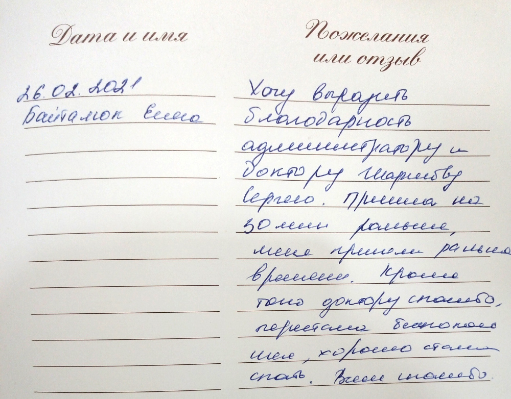 Хочу выразить благодарность администратору и доктору Шаршову Сергею. Пришла на 30 минут раньше, меня приняли раньше времени. Кроме того, доктору спасибо, перестала беспокоить шея, хорошо стала спать. Всем спасибо.