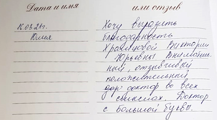 Хочу выразить благодарность Храмцовой Виктории Юрьевне. Внимательный, отзывчивый,, положительный доктор во всех смыслах. Доктор с Большой буквы.