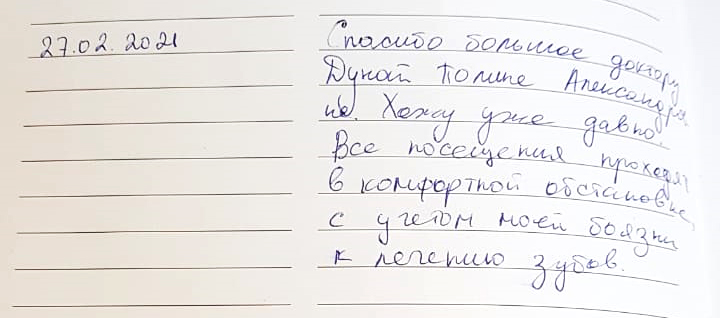 Спасибо большое доктору Дунай Полине Александровне. Хожу уже давно. Все посещения проходят в комфортной обстановке с учетом моей боязни к лечению зубов.