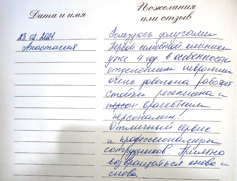 Пользуюсь услугами Первой семейной клиники уже 4 год, в особенности отделением неврологии, очень довольна работой стойки ресепшена и врачебным персоналом! Отличный сервис и профессионализм сотрудников. Приятно возвращаться снова и снова.