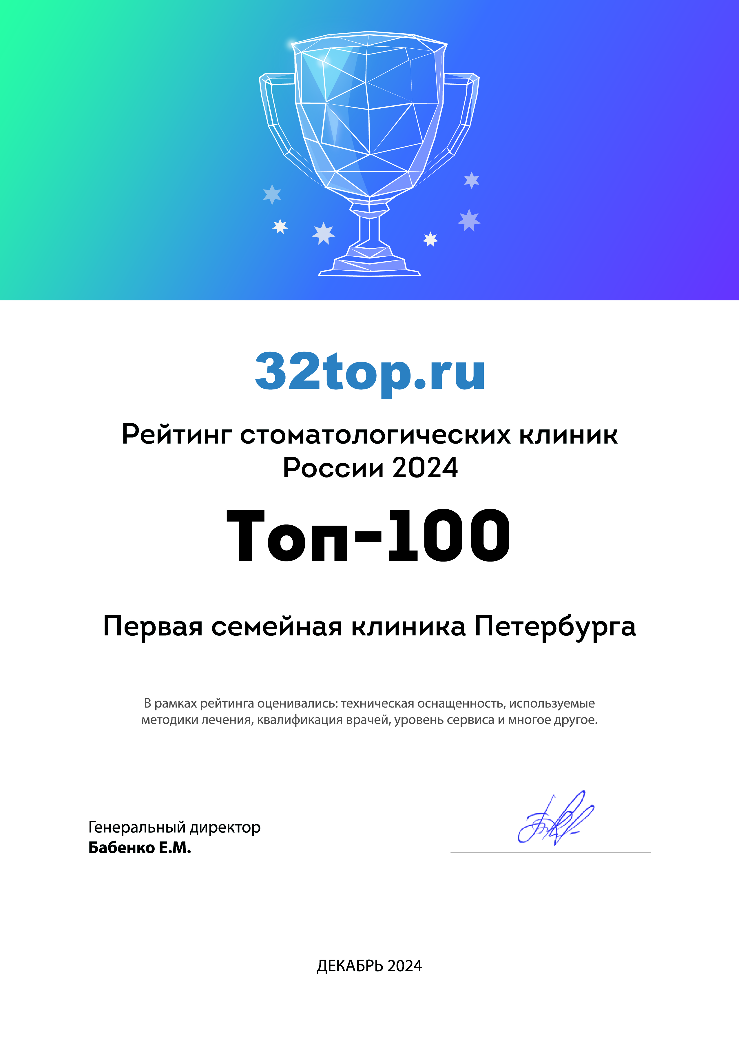 - В июне 2023 года сеть стоматологий «Первая семейная клиника Петербурга» получил диплом ТОП-10 лучших в номинации «Стоматология».