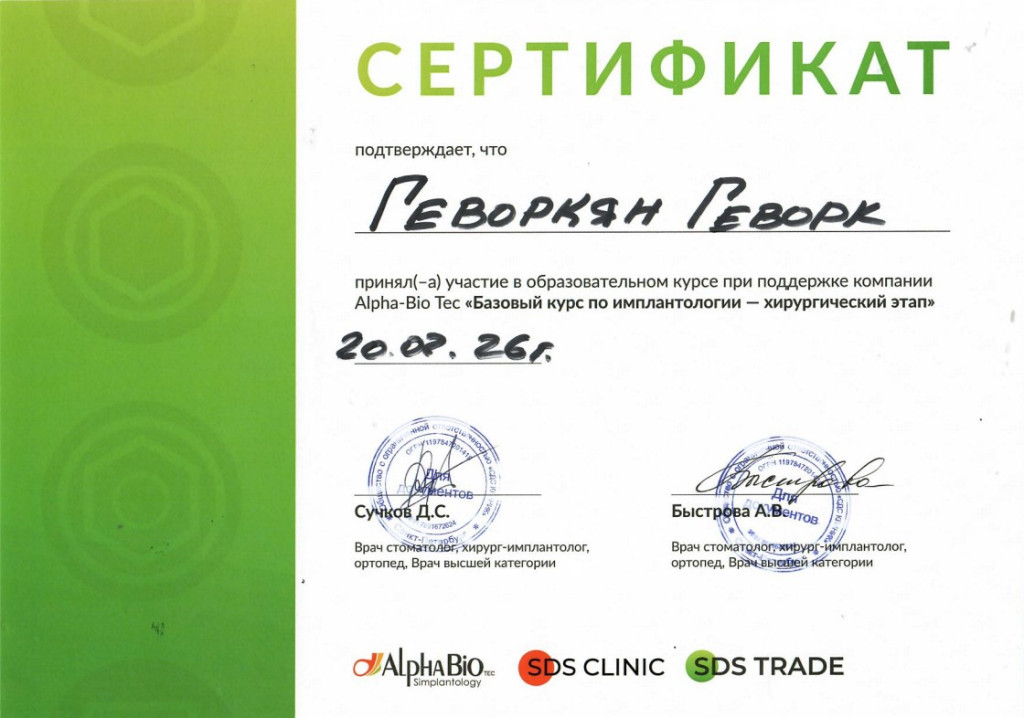 2024 г. - допуск к осуществлению медицинской деятельности на должностях среднего медицинского персонала п.30 приказа №715 от 25.06.2024 по специальности "Гигиенист стоматологический"
