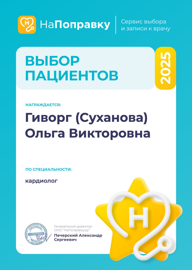 2025 г. - повышение квалификации по направлению "Эхокардиография в кардиологии и кардиохирургии", ФГБОУ ВО "Первый Санкт-Петербургский государственный медицинский университет имени академика И.П. Павлова" Минздрава России