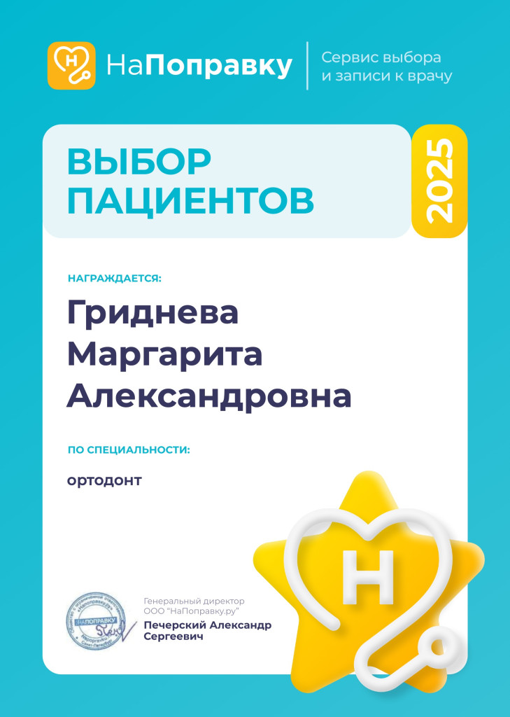 2019 г. - закончила ЧОУ «СПб ИНСТОМ» по специальности "Ортодонтия"