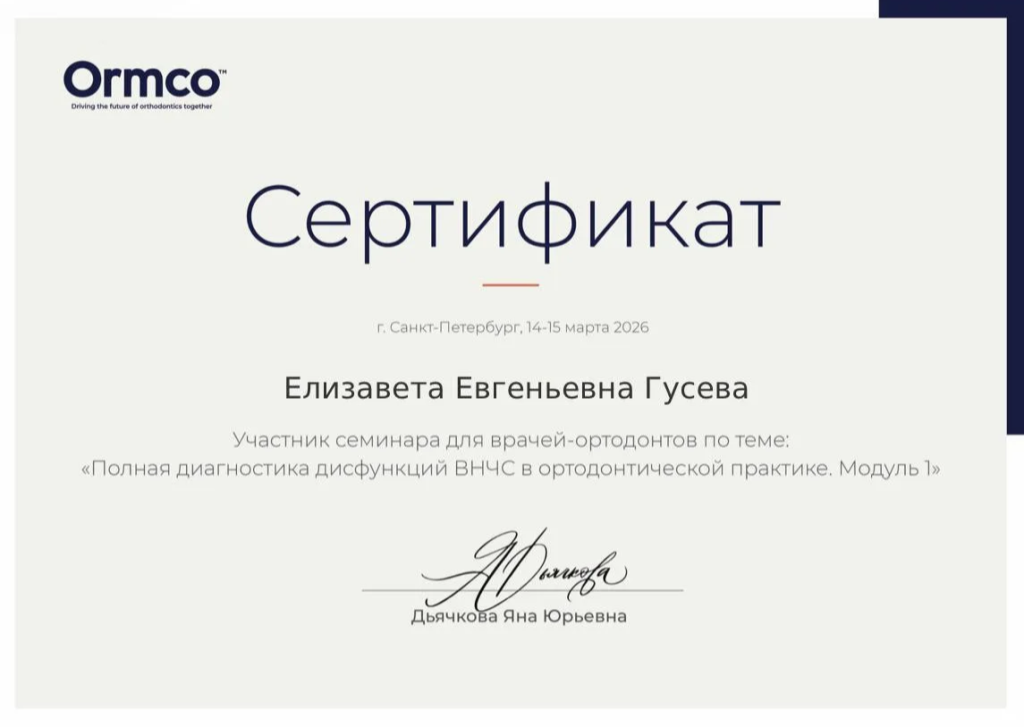 2015 г. - закончила ординатуру по специальности "Ортодонтия" при ФГБВОУ ВО "Военно-Медицинская Академия имени С.М. Кирова".