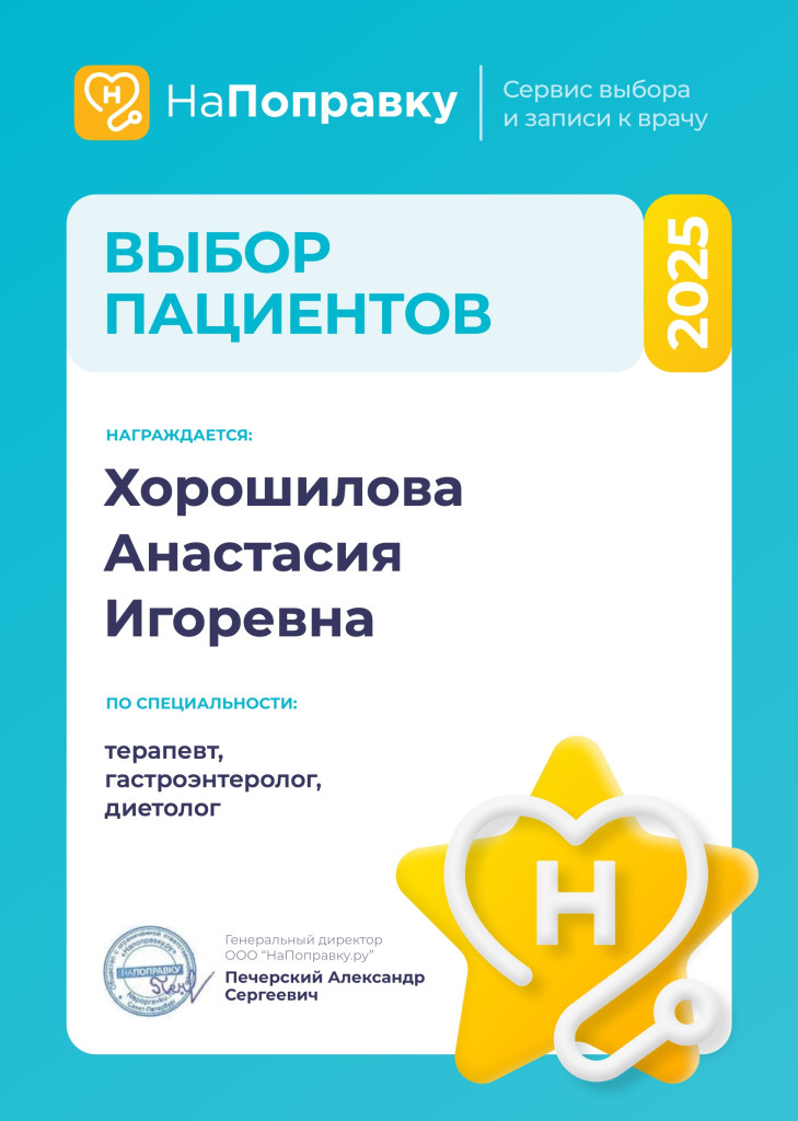 Анастасия Игоревна комплексно подходит к здоровью пациентов, сочетая знания терапии, гастроэнтерологии и диетологии.