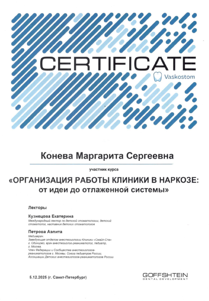 2025 г. - закончила ФГБОУ ВО "Первый Санкт-Петербургский государственный медицинский университет им. академика И.П. Павлова" по специальности "Стоматология"
