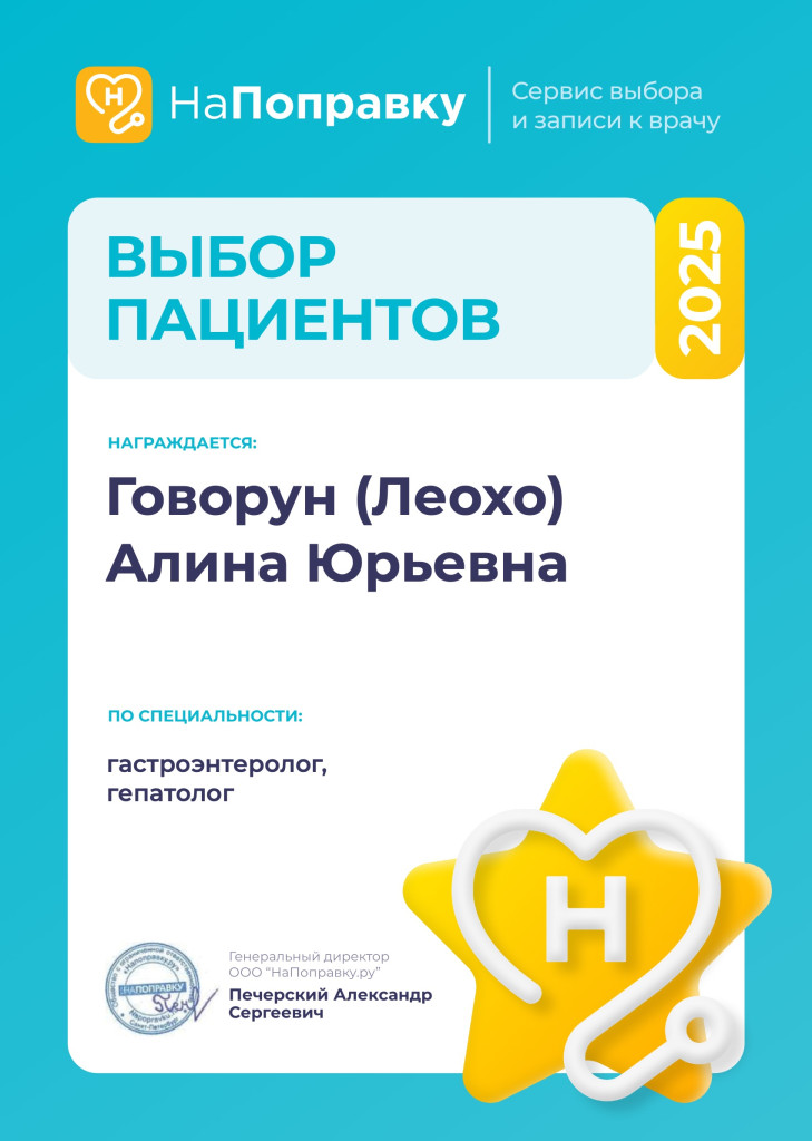 Сертификат по специальности «Гастроэнтерология» № 1178181042232 от 31.12.2020, ООО «Международный центр инноваций и обучения».