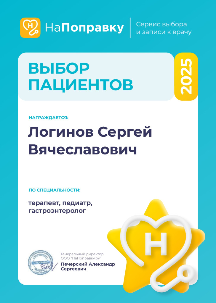 Как врач-педиатр доктор в полном объеме принимает детей от 6 лет, как врач-гастроэнтеролог ведёт приём взрослых и детей с 16 лет. Как врач общей практики Сергей Вячеславович проводит консультативно-диагностический прием взрослых пациентов по профилю кардиологии, неврологии, и пульмонологии.