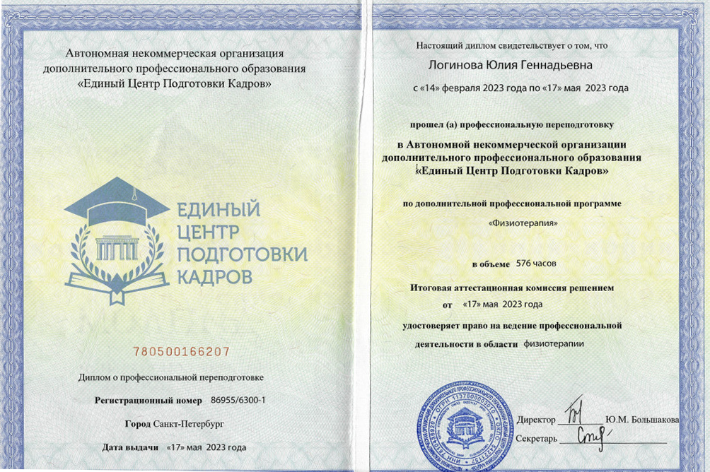 - 2023 г. - прошла профессиональную переподготовку в АНО ДПО "Единый центр Подготовки Кадров", по специальности "Физиотерапия", г. Санкт-Петербург.