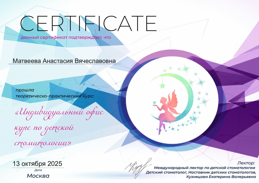 Анастасия Вячеславовна с большим вниманием и заботой относится к своим пациентам, легко находит подход к маленьким детям от 6 лет.