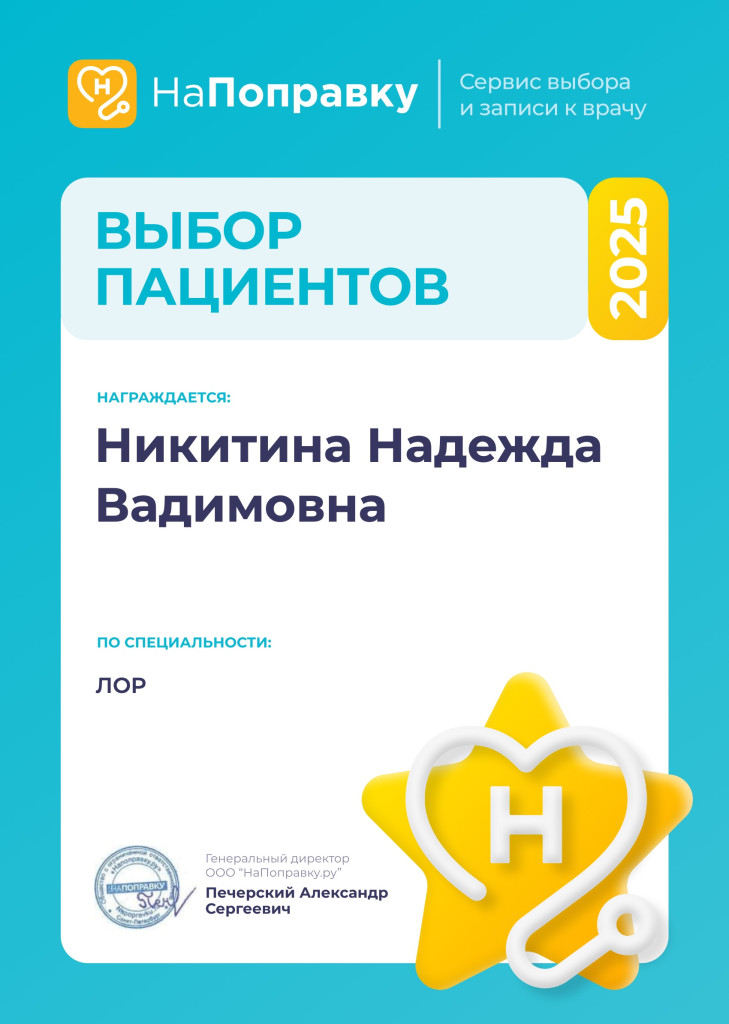 2024 г. - закончила ординатуру по специальности "Оториноларингология" на базе ФГБОУ ВО "Санкт-Петербургский педиатрический медицинский университет" Минздрава РФ