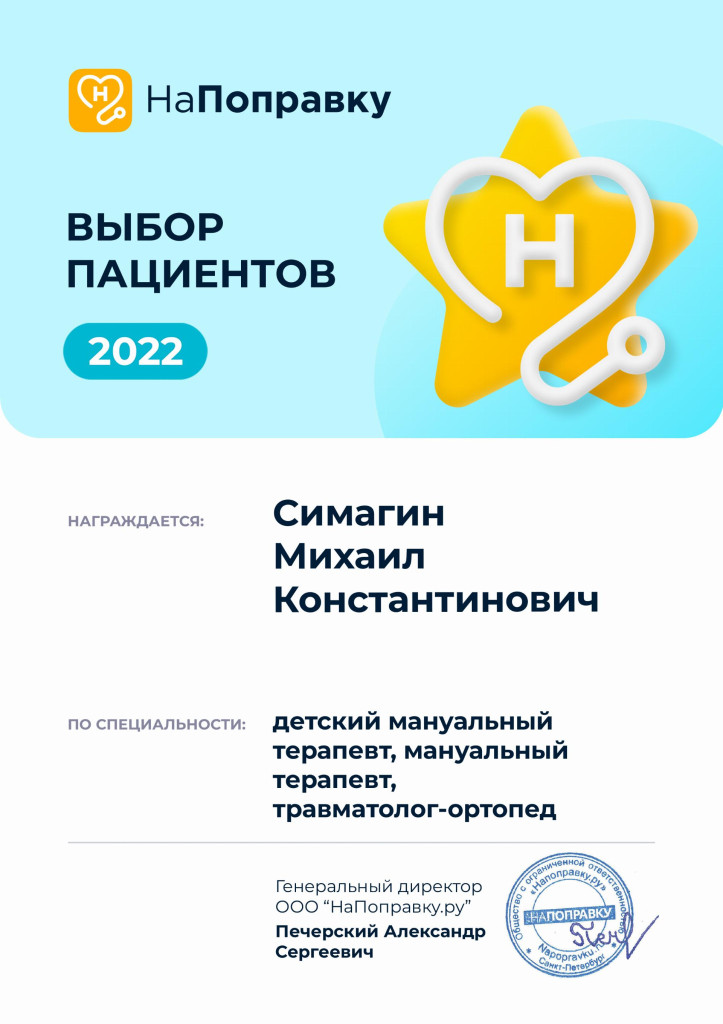 2008 г. — специализация «Мануальная терапия» на базе СПбГПМУ.
