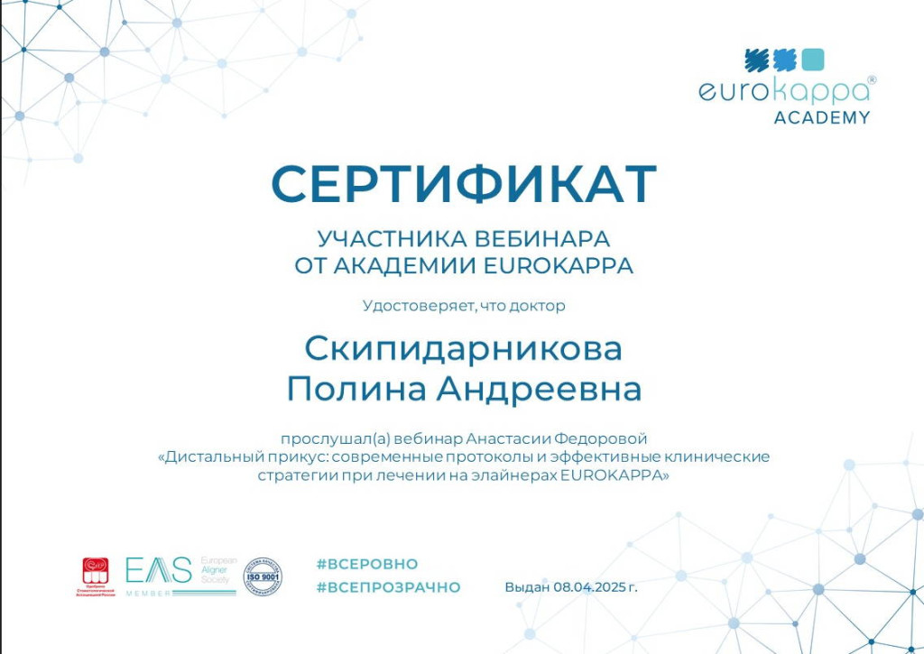 2025 г. - вебинар "Дистальный прикус: современные протоколы и эффективные клинические стратегии при лечении на элайнерах EUROKAPPA" - 2025 г. - вебинар "Движение вверх! Глубокий прикус у взрослых и детей"