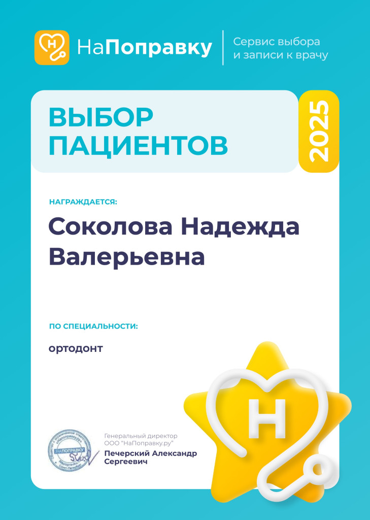 Надежда Валерьевна с большим вниманием и заботой относится к своим пациентам, легко находит подход как ко взрослым пациентам, так и к маленьким детям от 6 лет. Обратитесь к Надежде Валерьевне для профилактики и лечения заболеваний зубов, доктор подберет для вас верный путь к обретению здоровой, красивой улыбки.