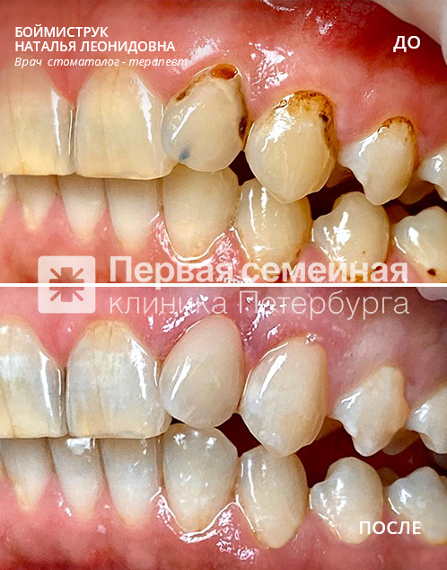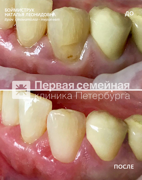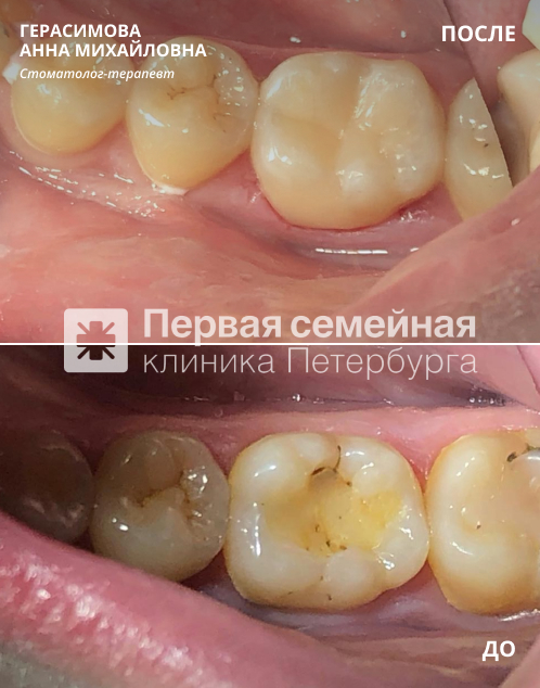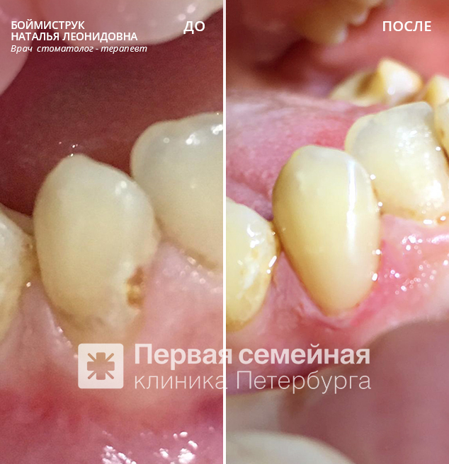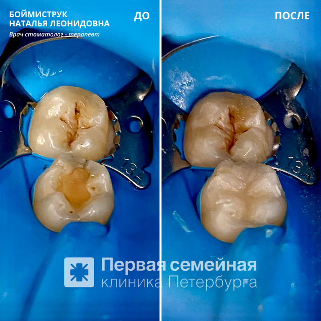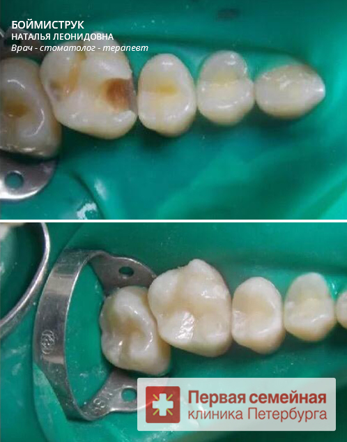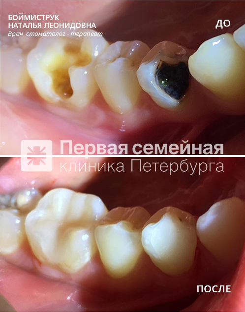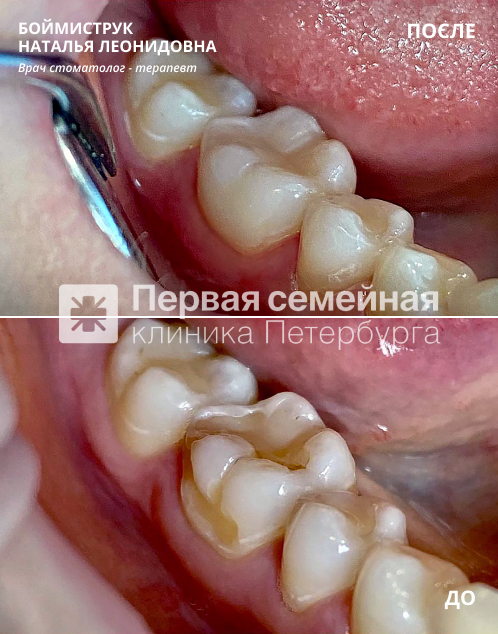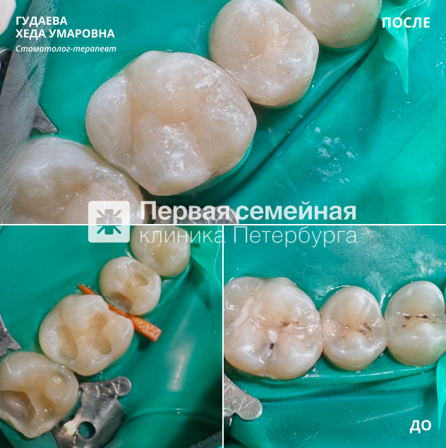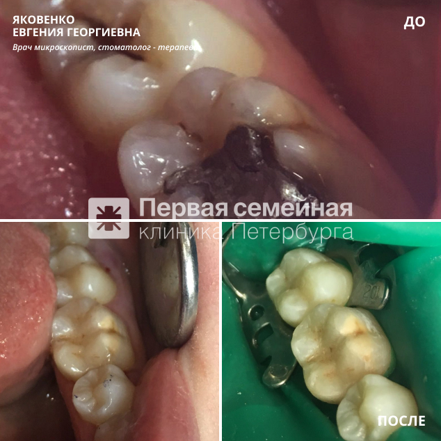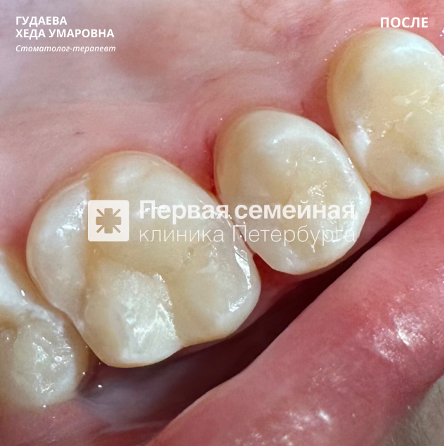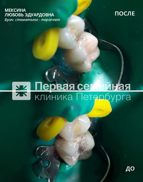 Разрушение более 50%. Зуб восстановлен композитной вкладкой. Следующий этап – лечение соседних зубов.
