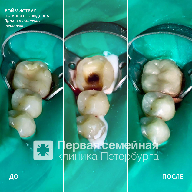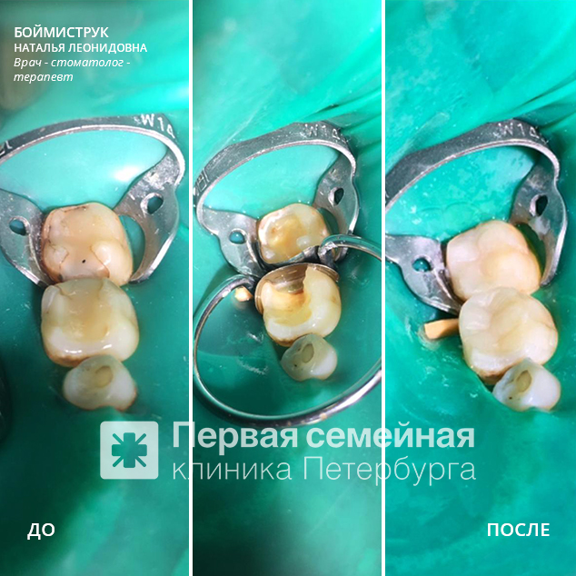 Сбор анамнеза, визуальный осмотр полости рта. При необходимости выполняется прицельный снимок зубов, который оплачивается дополнительно. Использование коффердама – по показаниям.